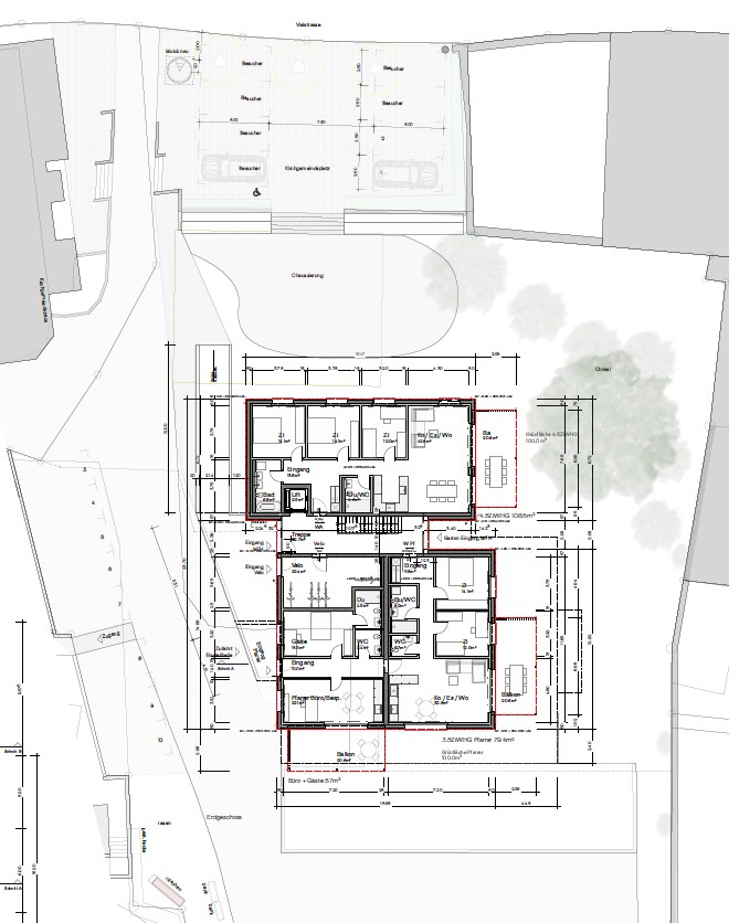 Die Wohnungen sind getrennt vom öffentlichen Bereich mit einem privaten, behindertengerechten Zugang erschlossen. Details ersehen Sie aus dem detaillierten Schemaschnitt. Die gedeckten Parkplätze im Untergeschoss können hausintern erreicht werden.
